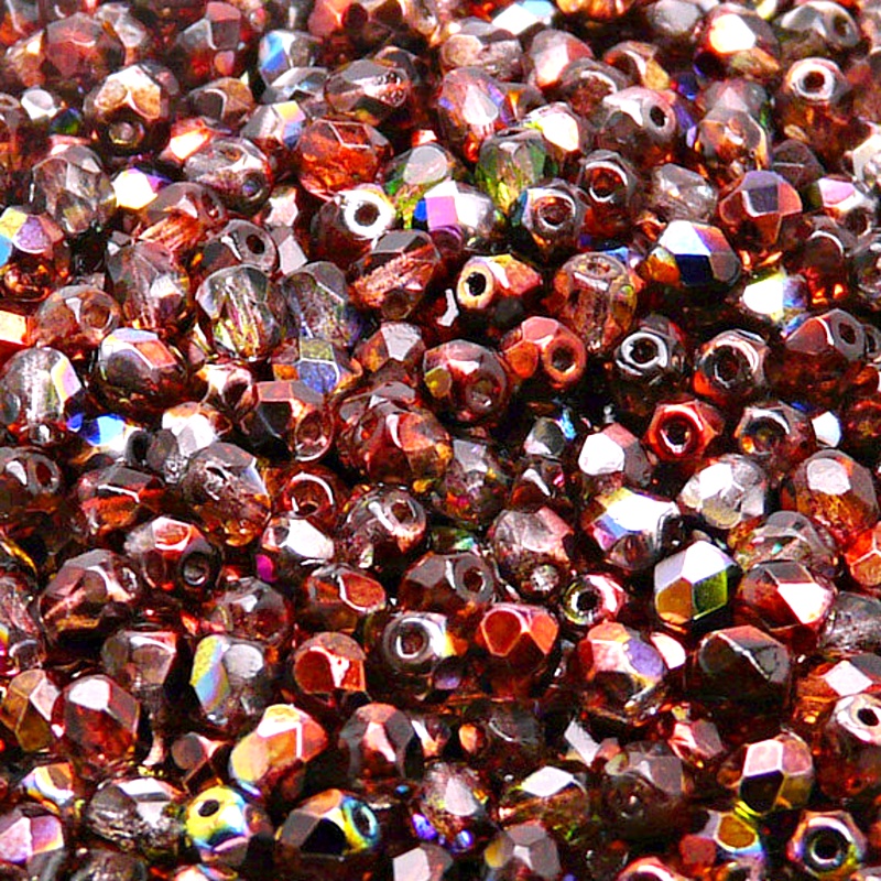 - 100ks České skleněné broušené ohňovky kulička 4mm čirá/ červeno hnědý magic