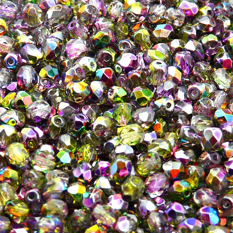 100ks České skleněné broušené ohňovky kulička 4mm čirá/ fialovo zelený magic