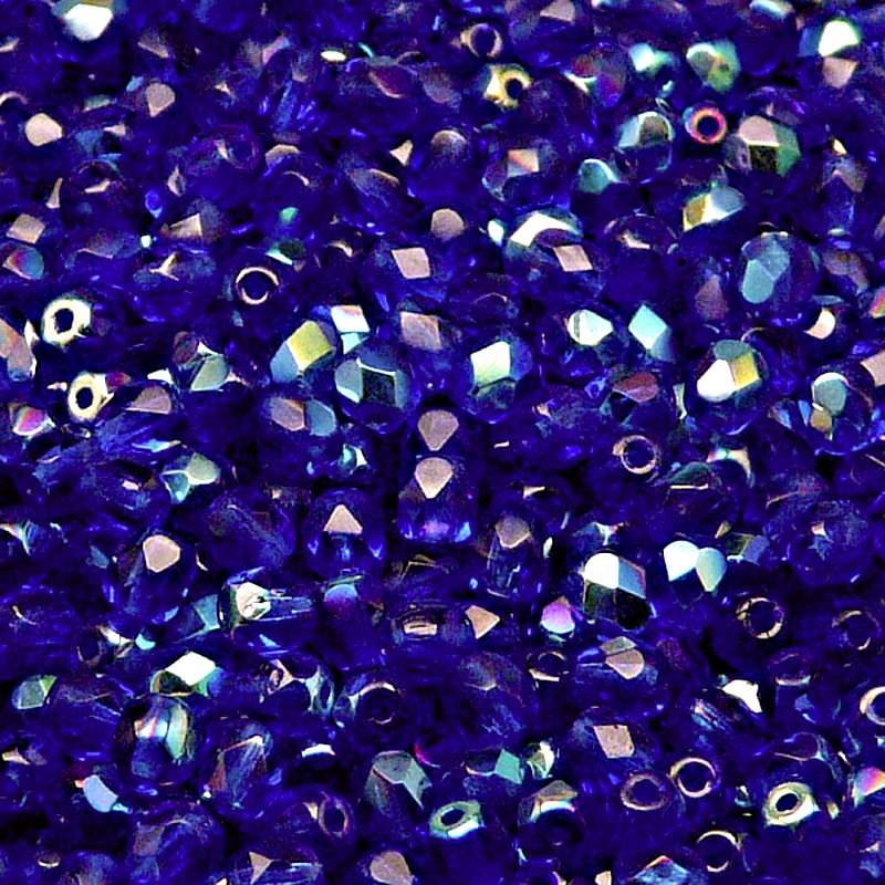 100ks České skleněné broušené ohňovky kulička 4mm modrý kobalt/ AB polopokovSkladem 26 ks51 Kč/ ks42,15 Kč bez DPH