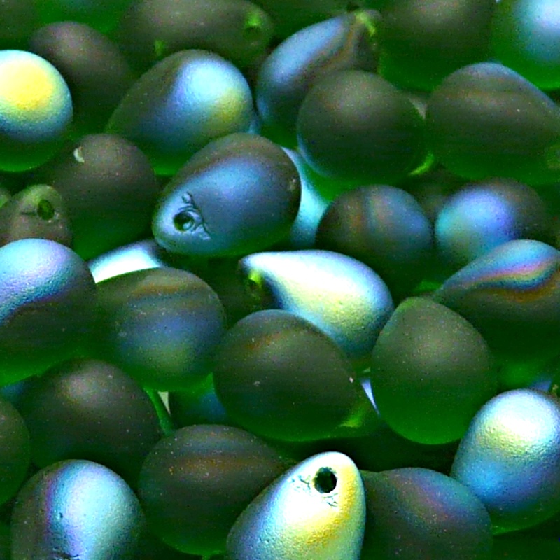 - 10ks České skleněné mačkané korálky kapky 10x14mm chrysolit/ AB polopokov mat