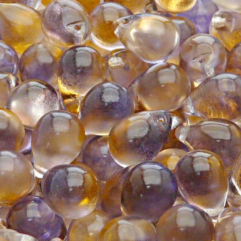 10ks České skleněné mačkané korálky kapky 10x14mm čirá/ oranžovo-fialový dvoubarevný stříkaný dekorSkladem 29 ks64 Kč/ ks52,89 Kč bez DPH