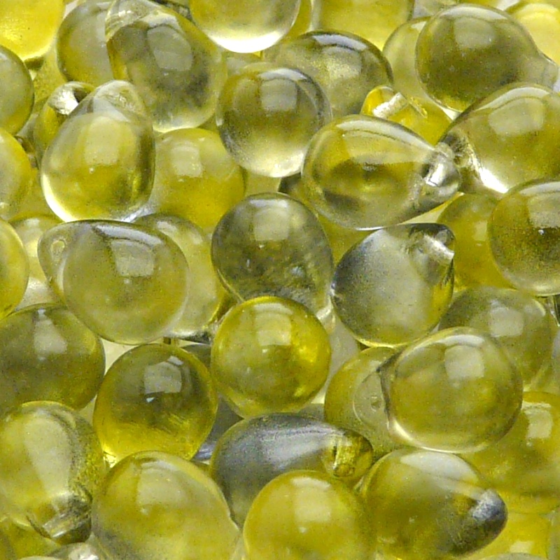 10ks České skleněné mačkané korálky kapky 10x14mm čirá/ žluto-modrý dvoubarevný stříkaný dekorSkladem 18 ks64 Kč/ ks52,89 Kč bez DPH