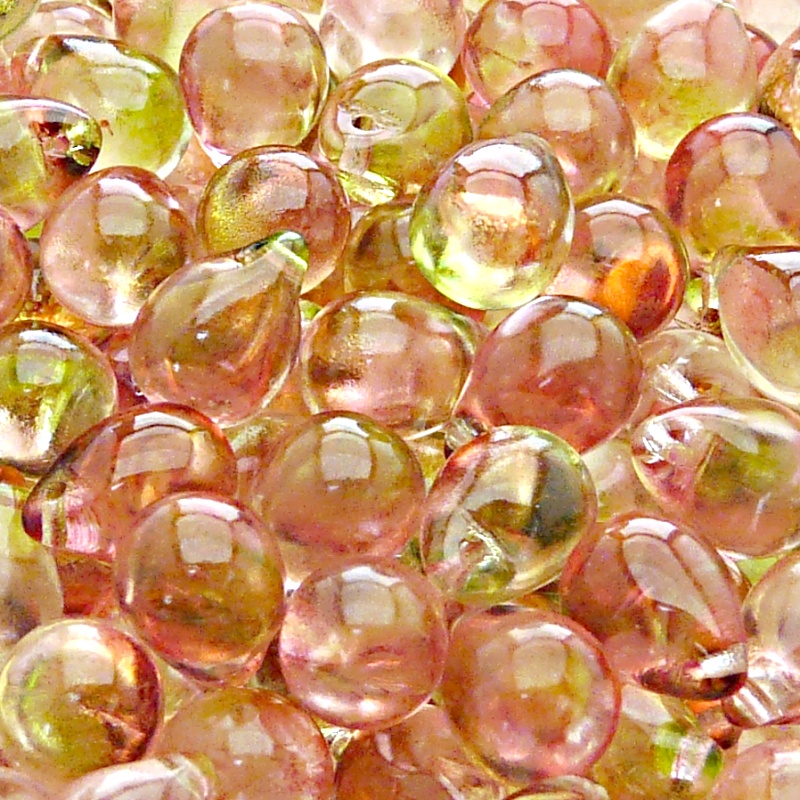 10ks České skleněné mačkané korálky kapky 10x14mm čirá/ oranžovo-zelený dvoubarevný stříkaný dekor