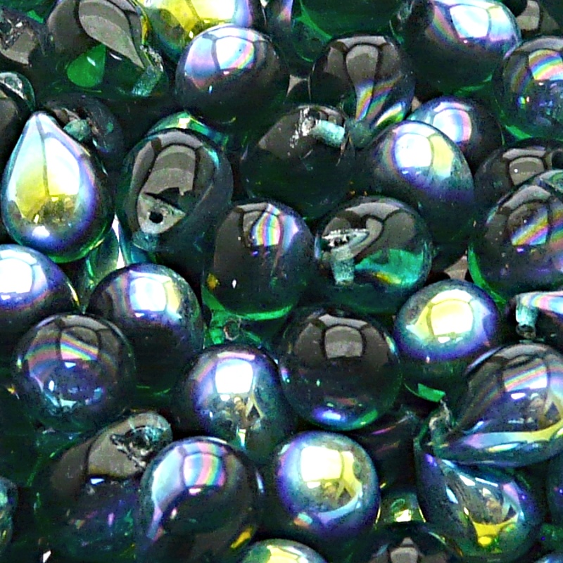 10ks České skleněné mačkané korálky kapky 10x14mm emerald/ AB polopokov
