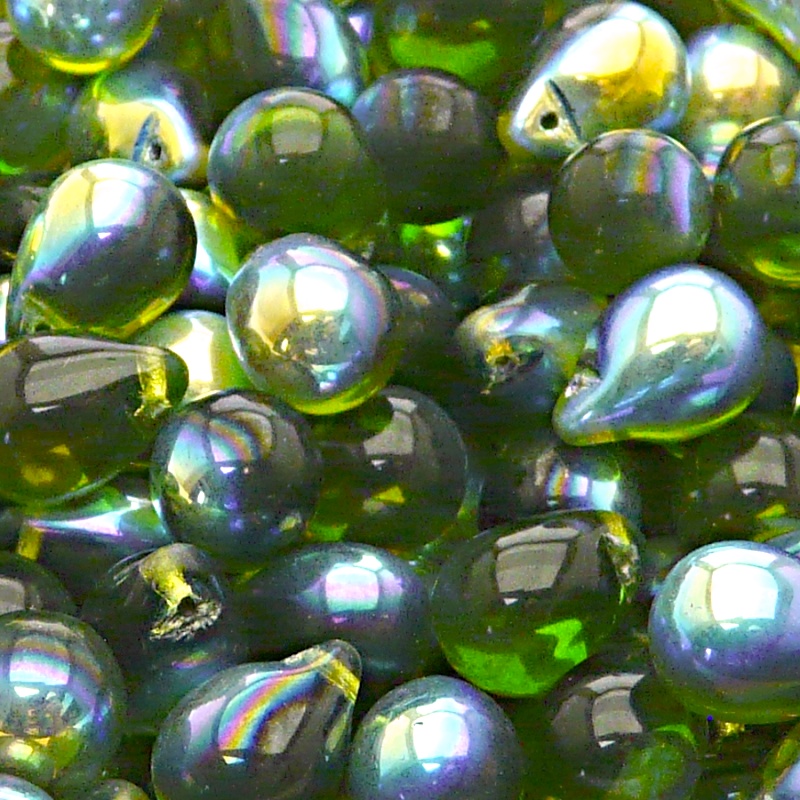 10ks České skleněné mačkané korálky kapky 10x14mm olivín/ AB polopokovSkladem 16 ks58 Kč/ ks47,93 Kč bez DPH