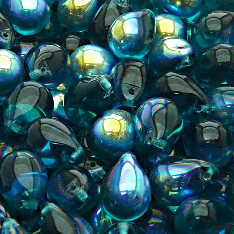 - 10ks České skleněné mačkané korálky kapky 10x14mm zelená akva/ AB polopokov
