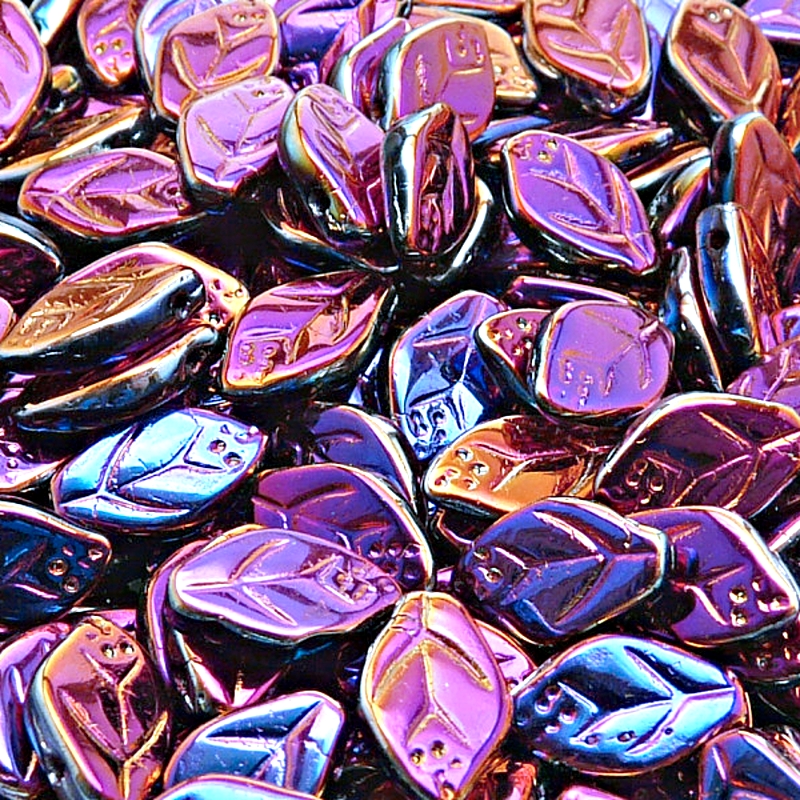 - 25ks České skleněné mačkané korálky lístečky 7x12mm černá/ sliperit celopokov