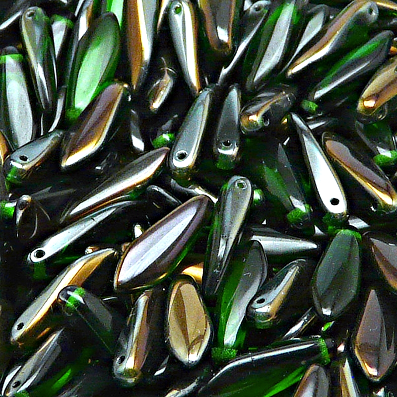 30ks České skleněné mačkané korálky jazýčky 5x16mm chrysolit/ valentinit polopokovSkladem 19 ks42 Kč/ ks34,71 Kč bez DPH