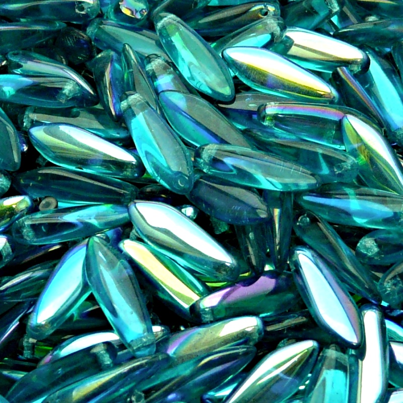 30ks České skleněné mačkané korálky jazýčky 5x16mm zelená akva/ AB polopokovSkladem 13 ks42 Kč/ ks34,71 Kč bez DPH