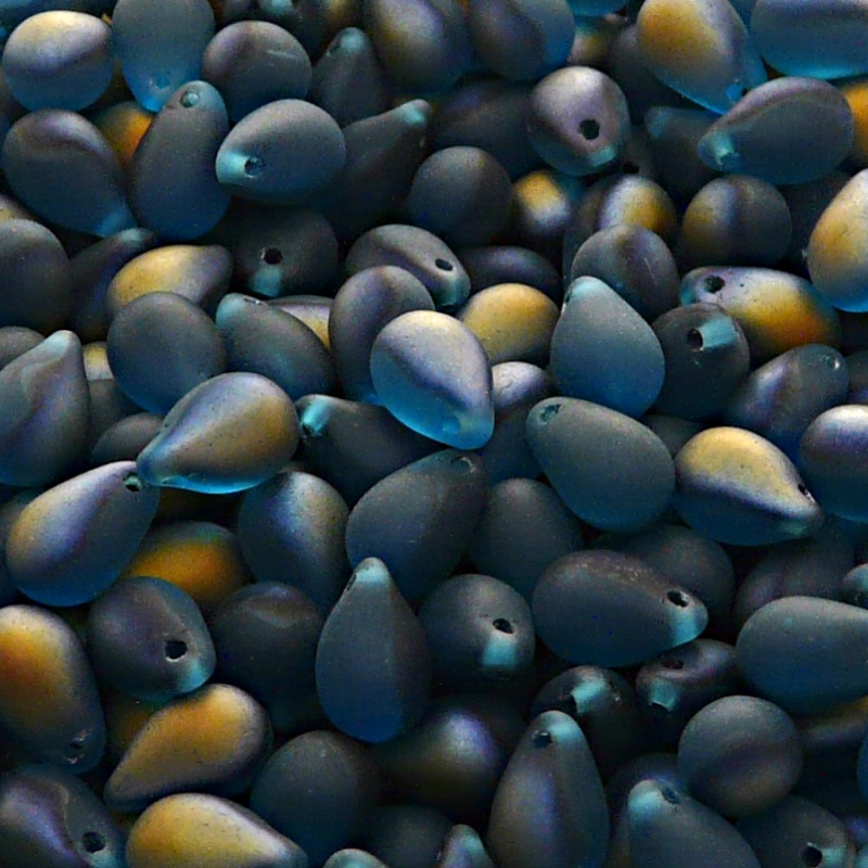 30ks České skleněné mačkané korálky kapky 6x9mm akva/ santander polopokov mat