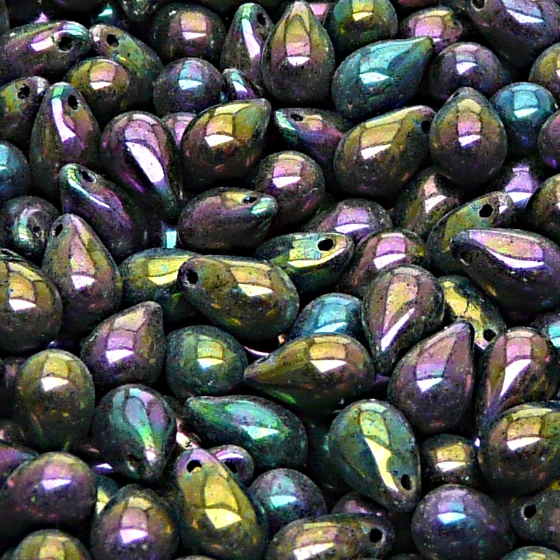 30ks České skleněné mačkané korálky kapky 6x9mm černá/ červený irisSkladem 27 ks50 Kč/ ks41,32 Kč bez DPH