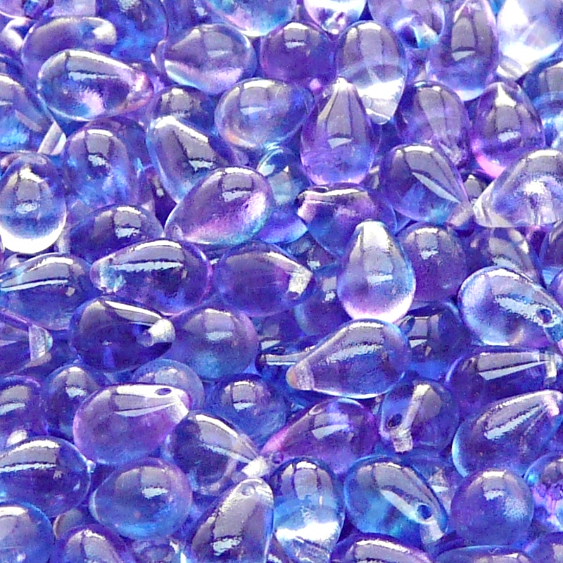 - 30ks České skleněné mačkané korálky kapky 6x9mm čirá/ modro-růžový dvoubarevný stříkaný dekor