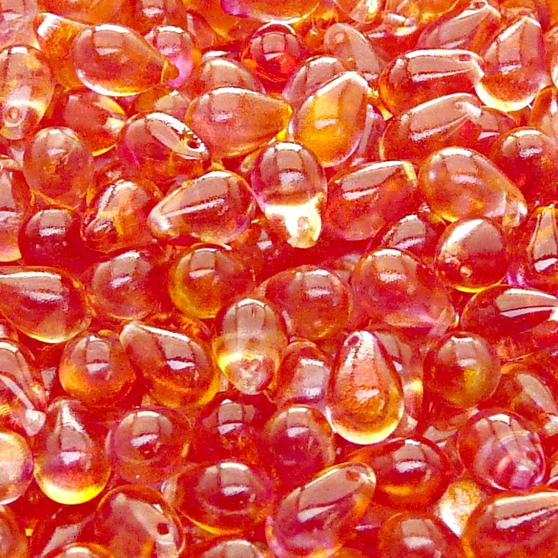 30ks České skleněné mačkané korálky kapky 6x9mm čirá/ červeno-růžový dvoubarevný stříkaný dekorSkladem 14 ks50 Kč/ ks41,32 Kč bez DPH