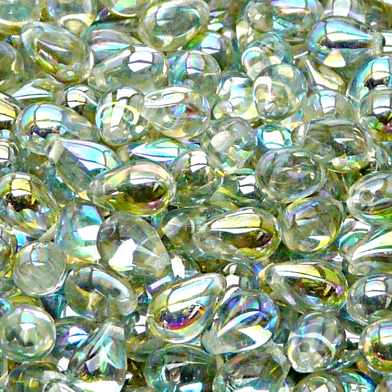 30ks České skleněné mačkané korálky kapky 6x9mm čirá/ zelená duhaSkladem 15 ks46 Kč/ ks38,02 Kč bez DPH