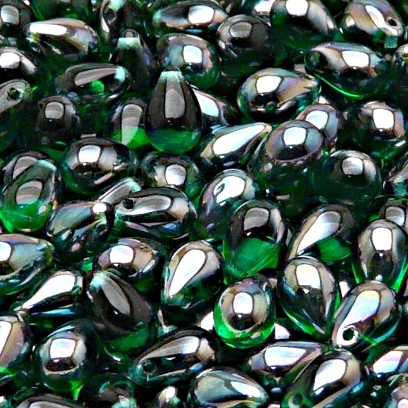 30ks České skleněné mačkané korálky kapky 6x9mm emerald/ celsian polopokovSkladem 13 ks42 Kč/ ks34,71 Kč bez DPH