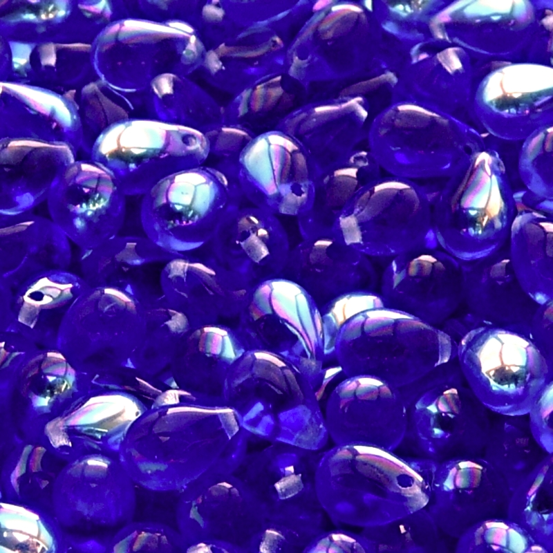 30ks České skleněné mačkané korálky kapky 6x9mm safír/ AB polopokovSkladem 14 ks42 Kč/ ks34,71 Kč bez DPH