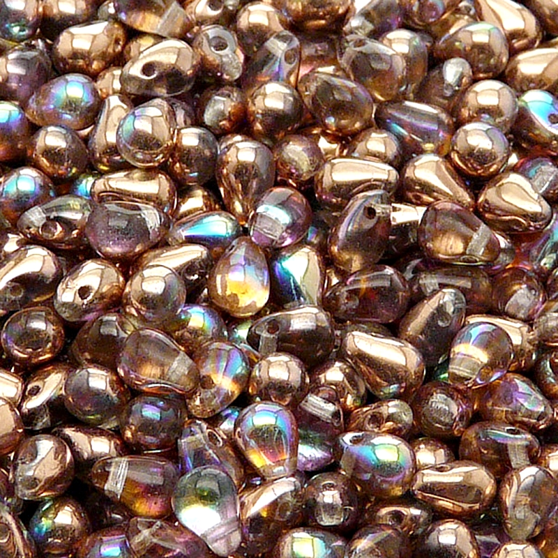 50ks České skleněné mačkané korálky kapky 4x6mm čirá/ měděná duha