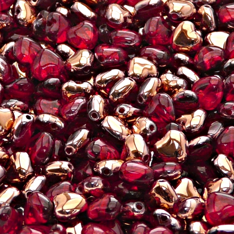 50ks České skleněné mačkané korálky srdíčko 6mm rubín/ gold capri polopokov