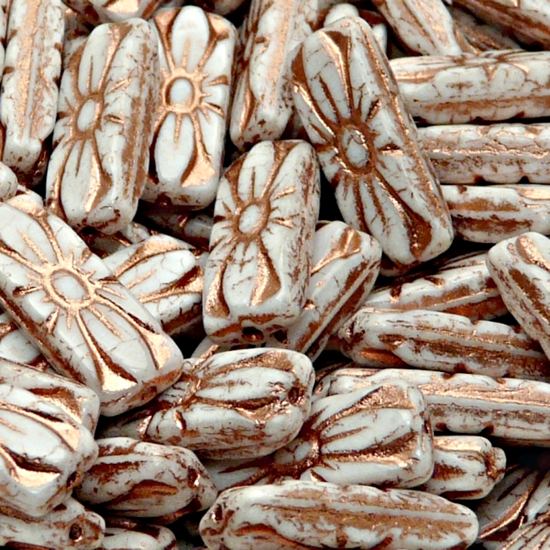- 8ks České skleněné mačkané korálky obdelník 20x8mm bílá/ bronyový zátěr