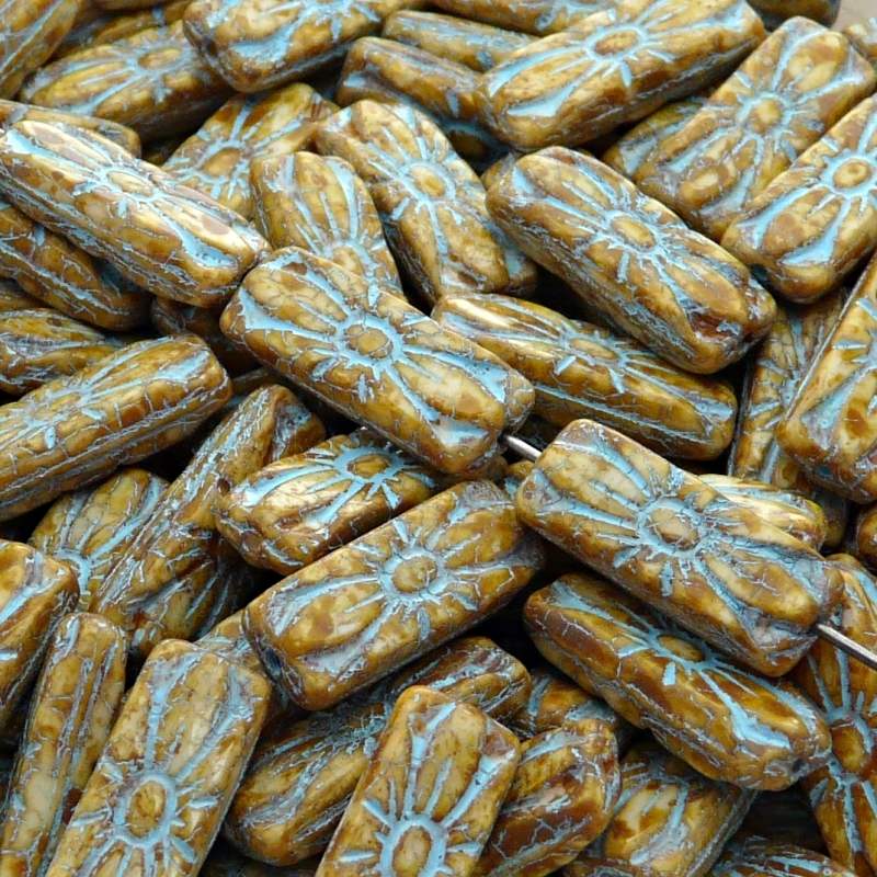 - 8ks České skleněné mačkané korálky obdelník 20x8mm bílá/ travertin se světle modrým zátěrem